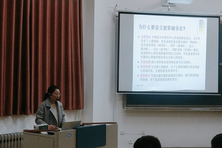 为进一步加强学院朋辈心理辅导员队伍建设,全面推进心理健康教育工作,2019年11月14日下午,beat365唯一官网在6号楼104教室成功举办“朋辈心理辅导员培训”,主讲人为学院心理辅导老师张春红。参加此次培训的人员有2019级心理委员以及宿舍朋辈心理辅导员等200余人。