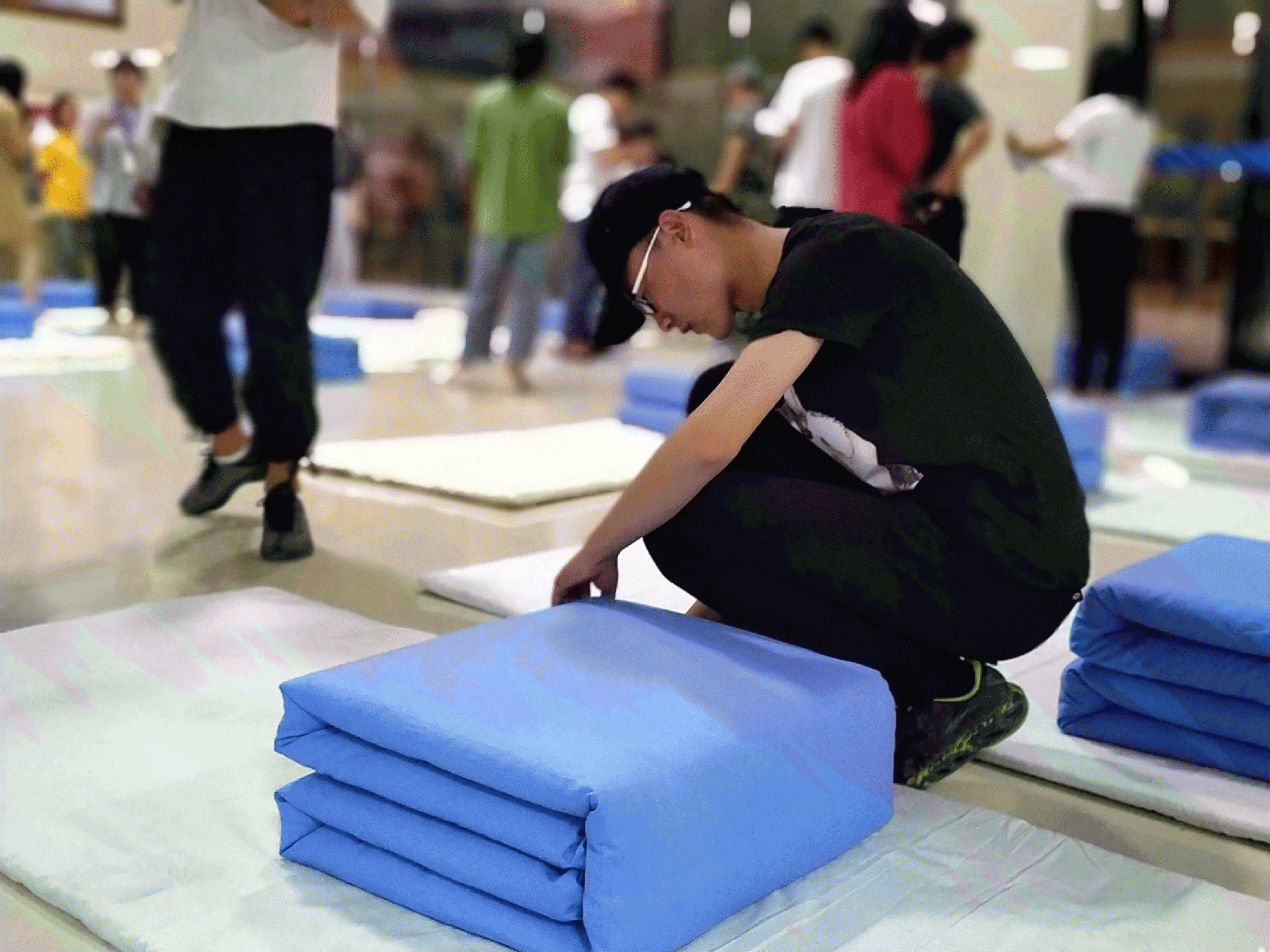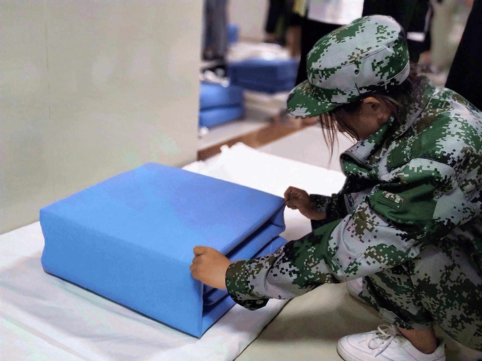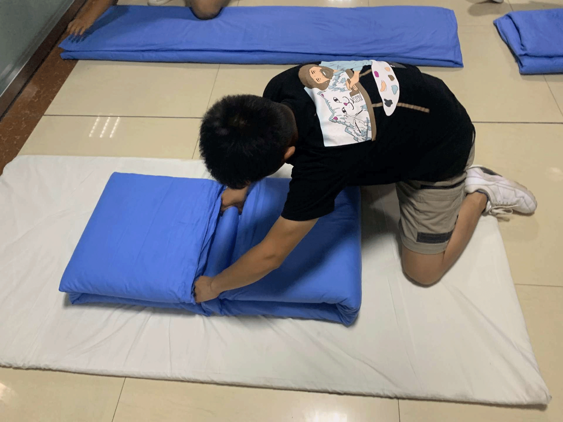 赛前,对班级进行初选后的一百余名参赛选手进行编号,选手按照顺序在指定区域摆好凉席,铺平棉被,主持人一声令下,比赛正式开始。整个比赛持续5分钟,每位参赛选手都严格按照军训的标准,认真整理被子,不放过任何一点褶皱的地方,将被子叠成“豆腐块”的形状,方方正正,棱角分明。比赛结束后,评委老师按照编号顺序开始打分,评委老师严格按照评分要求,并在评分的过程中给予参赛选手提出相应的改进意见。本次比赛,共产生一等奖10名,二等奖10名,三等奖15名,根据《beat365唯一官网2019级新生军训第六军事训练营优秀连队、先进集体、优秀个人的评选方案》,分别给获奖同学的班级和方队计入相应的考核,另外,获得一等奖的同学代表学院参加学校决赛。