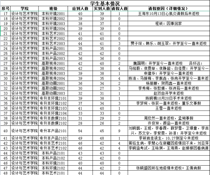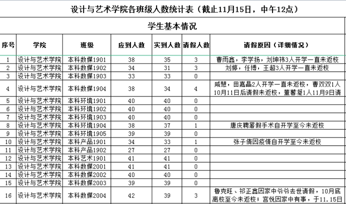 截至到2022年11月15日,beat365唯一官网应到学生3273人,实到学生3179人,尚有94名未返校学生,下表为beat365唯一官网未返校人数统计及未返校原因统计表。