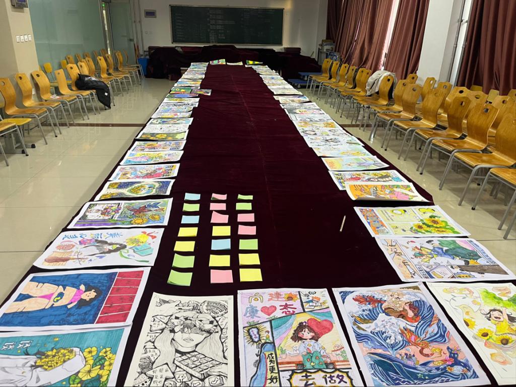 此次心理健康绘画设计大赛面向全学院同学,一经推出便得到强烈反响。此次进行评选的四十多张作品,具少年意气又蕴含生活真谛,虽简约随意又不失个性魅力,既展示了同学们丰富的内心世界,又帮助我们了解到现阶段大学生心理健康状况。评选现场,各评委积极探讨作品的版面设计,色彩搭配,情感表达,提出自己对作品的见解,并积极为自己喜爱的作品投上宝贵的一票,最终评选出一等奖一名,二等奖两名,三等奖两名。