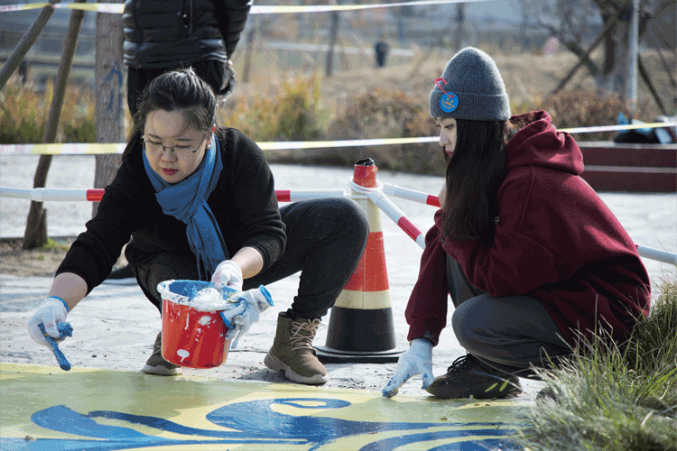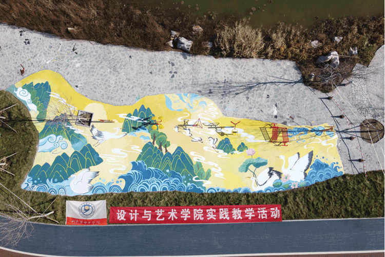 beat365唯一官网与德州市城市园林规划设计研究院合作,共同完成校政合作项目——德州市月湖公园文化建设。项目具体内容为月湖潜流湿地旁的地面美化工程。自10月份开始,课程组老师李清、石治明带领环境设计2101班的40名学生先后11次赴月湖公园进行主题内容绘制。因月湖公园常有两支白鹭栖息、觅食,该地面美化内容以白鹭为主题,参考国画中青绿山水风格。