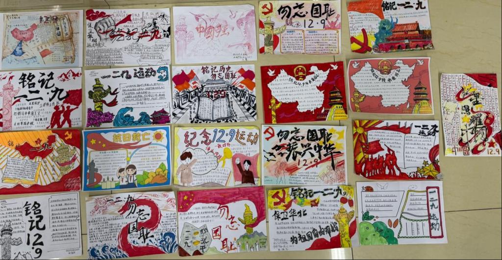 活动以小组为单位进行,团员们在小组内分工合作,共同完成手抄报创作任务。在小组创作过程中,团员们充分发挥各自的创意和特长,紧密合作,共同完成手抄报作品。他们认真筛选收集到的资料,精心撰写文字内容,力求准确、生动地展现“一二・九”运动的历史风貌。在版面设计方面,团员们运用绘画、排版等技巧,巧妙地将文字与图片相结合,通过不同的色彩搭配和图案装饰,使手抄报既具有丰富的历史内涵,又富有艺术美感。有的小组以时间轴为线索,详细描绘了“一二・九”运动的发展历程;有的小组则突出展现了运动中的英雄人物和感人瞬间,配以激昂的文字,感染力十足;还有的小组从当代青年的视角出发,探讨了“一二・九”运动精神的传承与发扬,具有较强的时代感。
