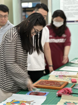 学院科研科国林恺老师为本次活动宣讲员。活动中,国老师向师生介绍了杨家埠木版年画的历史,细致讲述了非遗传承人杨洛书先生的传承故事。以杨家埠传统年画为案例,分析木版年画的艺术风格和题材特点。又通过木版年画印刷过程的影像资料生动形象地展示了木版年画套色印刷技艺的独特魅力。本次活动邀请学生亲身体验木板转印的过程和学校相关建筑主题的套色印章。最后,国老师为参加活动的学生送出美好寄语——以设计为抓手,架起传统文化与现代社会的桥梁,以传统文化为沃土,绽放创新与传承之花。