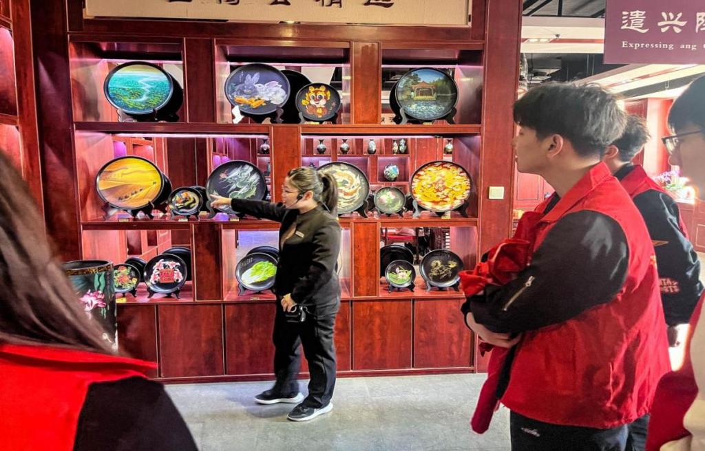 活动现场,讲解员张老师为同学们详细介绍了德州梁子黑陶的传承、创新以及发展情况,并着重介绍了馆内代表性作品,包括在全国享有盛名的“盛世祥龙”、“鱼戏莲叶”、“五虎上将”和“微雕蛋壳陶”等,其中微雕陶作品运用硬刻陶技术、微雕技法在陶体上进行汉字雕刻,汉字的微小精细程度令人叹为观止。黑陶,黑中透莹、望之如金、坚实凝重、叩之如磬。作为土与火的艺术,力与美的结晶,黑陶被称作地球文明最精致之制作,黑陶也是蕴藏着龙山文化的绚丽瑰宝,被誉为德州的三绝之一,列入国家非物质文化遗产名录。这里的黑陶艺术让同学们流连忘返。