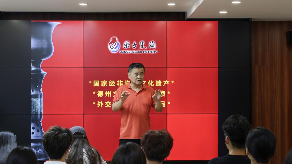 活动伊始,毛军和曲建坤两位传承人以生动的语言和丰富的实物展示,向师生们讲述了黑陶悠久的历史渊源。从新石器时代的龙山文化讲起,传承人详细介绍了黑陶烧制技艺的历史演变、工艺流程以及独特的艺术价值。通过视频和实物的结合,师生们仿佛穿越时空,亲眼见证了黑陶“黑如漆、亮如镜、薄如纸、硬如瓷”的独特魅力,对这项古老的技艺肃然起敬。