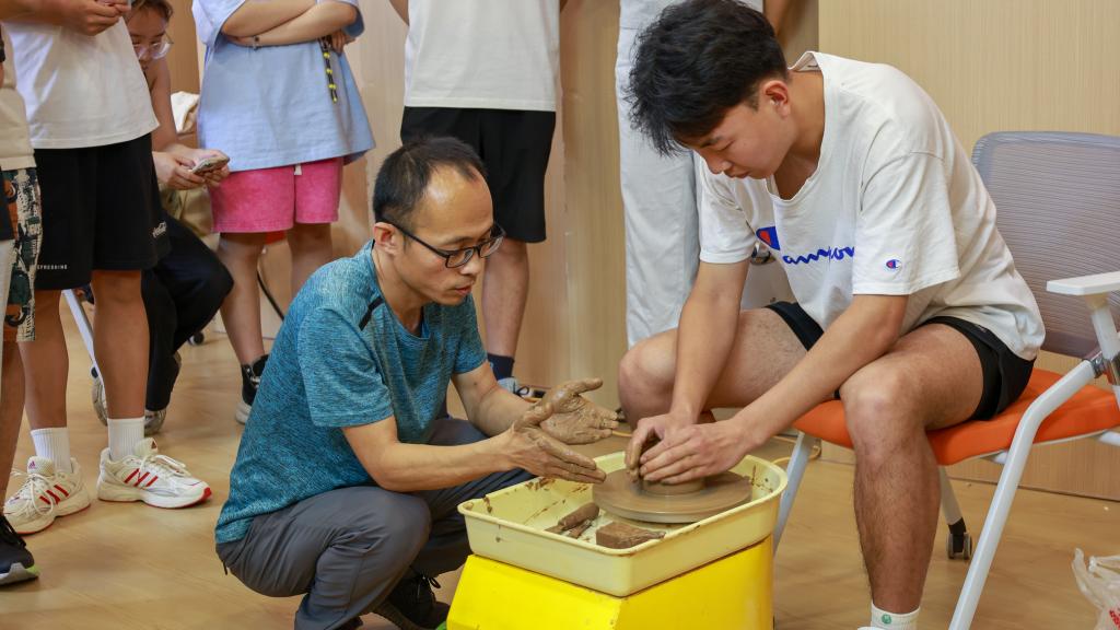 随后,活动进入了最令人期待的体验环节。在传承人的耐心指导下,师生们纷纷拿起陶泥,体验了黑陶拉坯成型的乐趣。传承人一边讲解拉坯、捏塑的基本技巧,一边进行示范,师生们聚精会神地模仿着老师的动作,尝试着将手中的陶泥变成心中所想。教室里,时而传来陶泥掉落的小小惊呼,但更多的是作品初成型时的欣喜欢笑。虽然初次尝试黑陶制作略显稚嫩,但每一件作品都凝聚着师生们的热情与专注,展现了他们对传统文化的热爱与追求。
