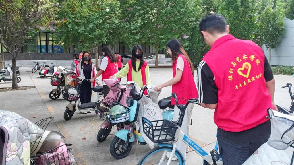 活动中,小组成员们在各小组组长的带领下,分工明确,有序投入到校园共享单车整理与环境卫生清扫工作中。 将随意停放的共享单车有序归位,让原本杂乱的停车区瞬间变得井然有序。