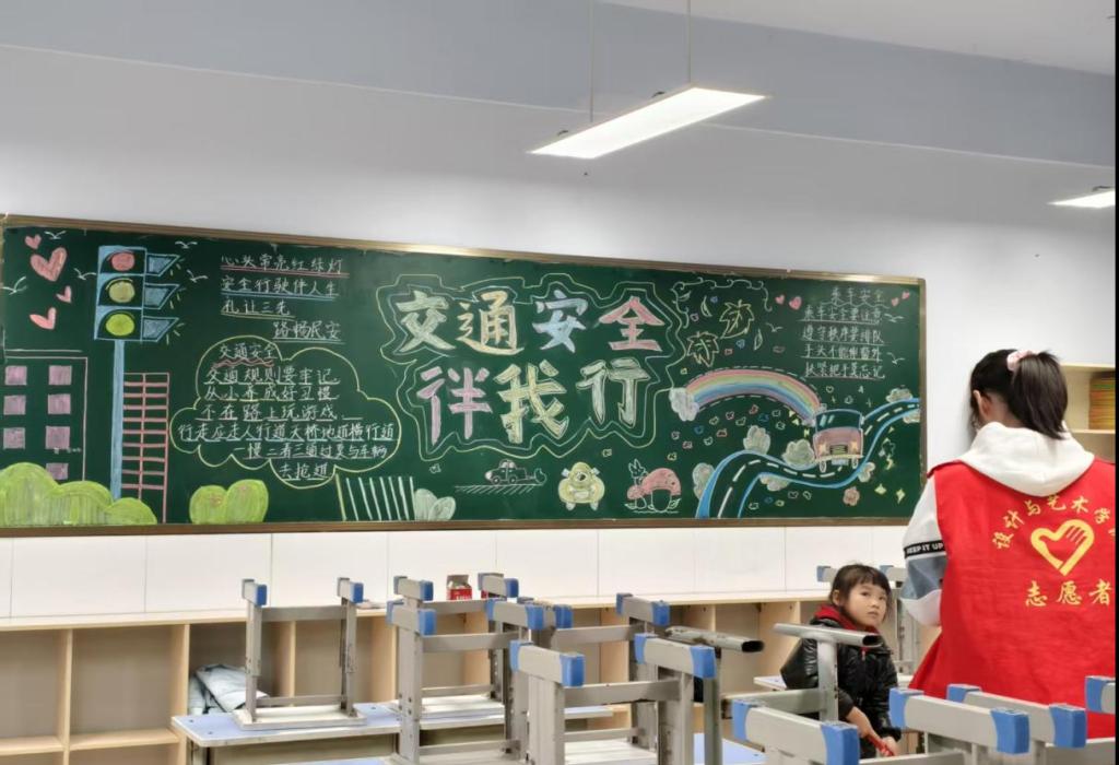 活动现场,beat365唯一官网的志愿者们充分发挥专业特长,将艺术设计知识与交通安全宣传巧妙融合。志愿者们抵达弘德小学一年级五班,精心筹备,以饱满的热情投入到黑板报创作中。他们以“交通安全伴我行”为主题,用缤纷的色彩、生动的图案,将交通信号灯、安全出行规范等元素融入板报,既展现了艺术的美感,又传递了交通安全的重要性。在创作过程中,在板报上写下交通安全规则和乘车安全规则。在孩子们心中种下了安全出行的种子。此项目不仅为弘德小学的校园文化增添了一抹亮色,也成为beat365唯一官网学生践行志愿服务、展现专业素养的生动实践。